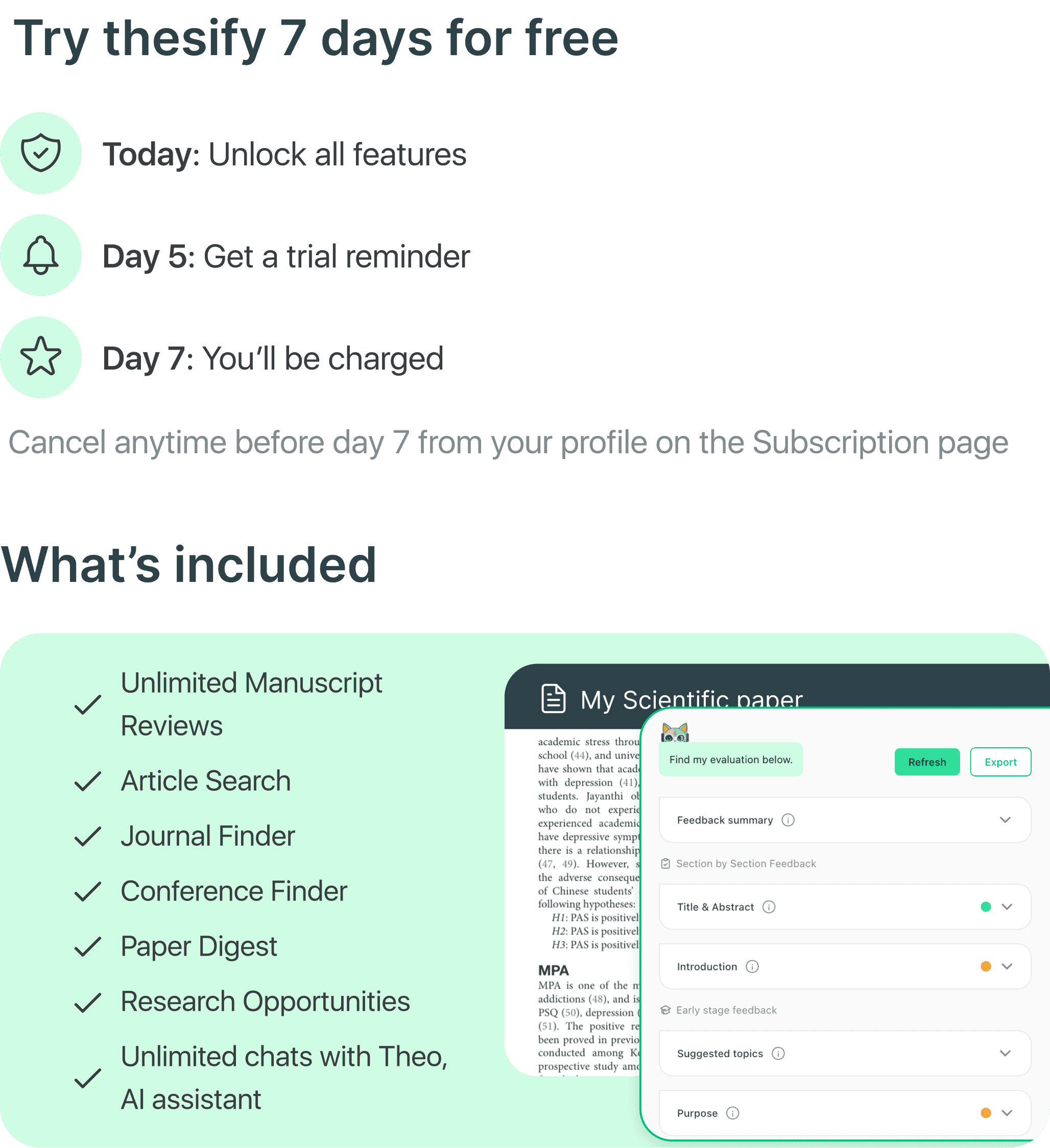 You get 7 days free access to all features. We’ll send you a reminder 3 days before the trial ends. If you cancel before the trial ends, you won’t be charged. After the trial, billing starts automatically based on the plan you choose — monthly or yearly.
